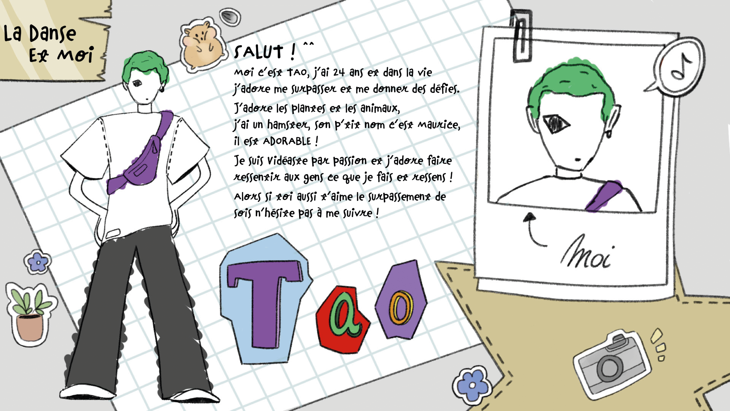 Workshop de conception d’émission en kit. L’objectif était d’imaginer un programme complet en rapport à la danse. J’ai donc imaginé: La Dance et Moi, où Tao, débutant en danse, explore différents styles et partage son apprentissage avec humour et authenticité. J’ai développé l’univers visuel et sonore de l’émission — nom, logo, jingle, transitions, séquences animées et lancements de rubriques — afin de créer une identité cohérente et reconnaissable. Cette approche transversale, mêlant direction artistique, storytelling et motion design, a permis de concevoir un univers dynamique et immersif, fidèle à l’esprit du programme et adapté aux jeunes spectateurs.